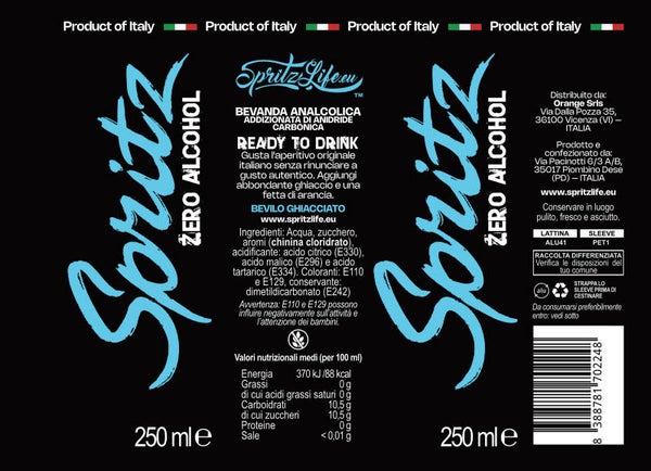 Ingredienti: Acqua, zucchero, aromi (CHININA CLORIDATO), acidificanti: acido citrico (E330), acido malico (E296) e acido tartarico (E334). coloranti: E110, E129. Conservante: dimetildicarbonato (E242).